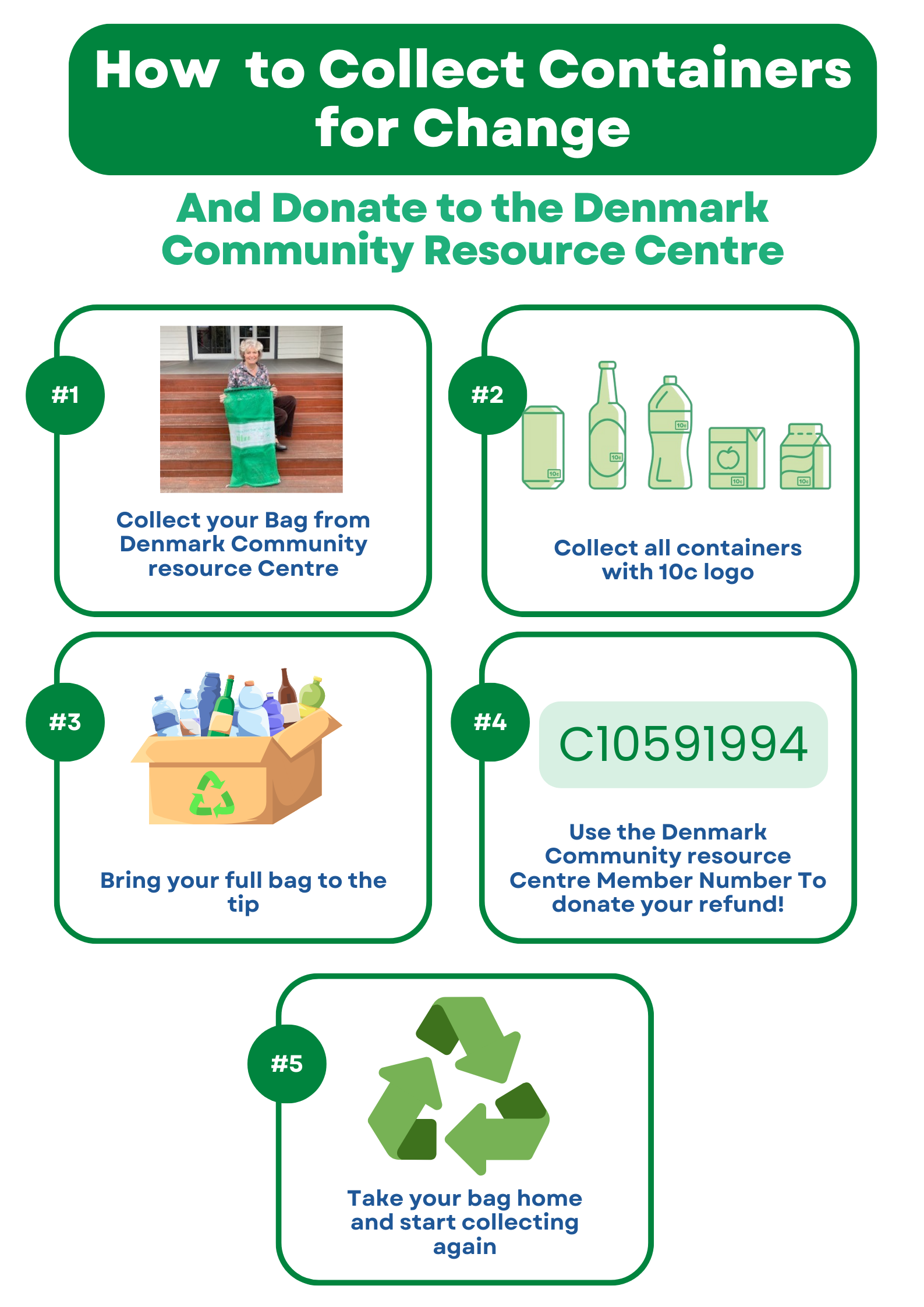 Did you know your refund can be directly donated to the Denmark Commmunity Resource Centre? by using our member number when returning your cans to the tip enter our member number and instantly donate your refund.