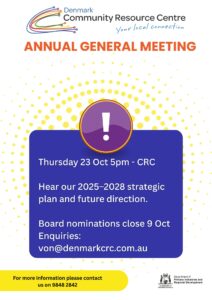 « All Events This event has passed. AGM Denmark CRC October 23 @ 5:00 pm - 7:00 pm « Life Drawing Classes Karri Kids Potions in the Park » Denmark CRC Add to calendar Google Calendar iCalendar Outlook 365 Outlook Live Details Date: October 23 Time: 5:00 pm - 7:00 pm Event Categories: Community Event, Education, Free, Information Sessions Venue Denmark CRC 2 Strickland St Denmark, WA 6333 Australia + Google Map Phone 9848 2842 View Venue Website Related Events Green Skills Denmark Community Garden December 6 @ 3:00 pm - 5:00 pm Christmas Choir Concert December 6 @ 7:00 pm - 8:30 pm Pen & Possibility Creative Writing Workshop December 9 @ 10:00 am - 12:00 pm