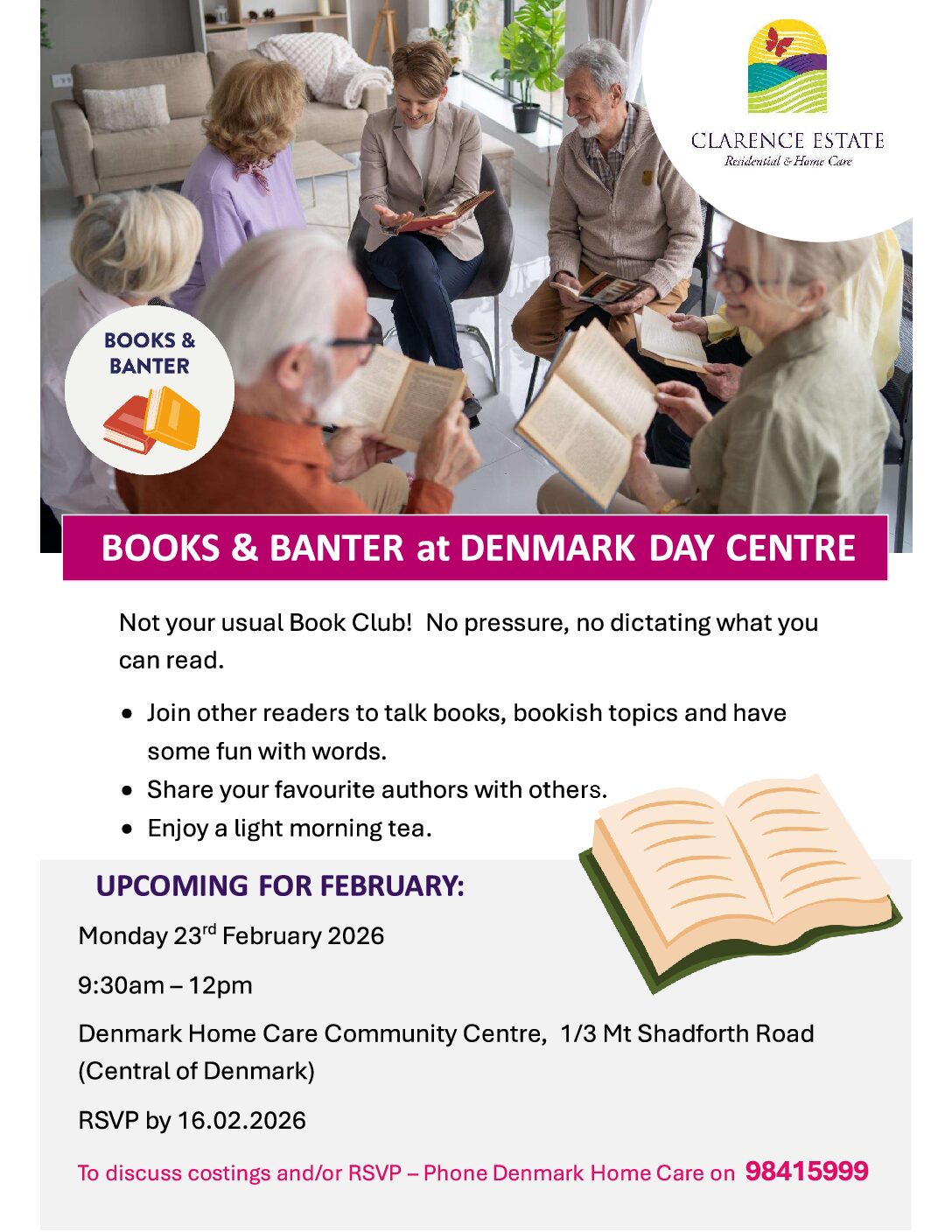 « All Events Books & Banter February 23 @ 9:30 am - 12:00 pm « Happy Plate Pen & Possibility Creative Writing Workshop » book Add to calendar Google Calendar iCalendar Outlook 365 Outlook Live Details Date: February 23 Time: 9:30 am - 12:00 pm Event Categories: Be Connected, Community Event, Discover Denmark, Entertainment, Health, Men, Mental Health, Networking, Older Australians, Social Event, Wellness, Women Related Events Denmark Summer Early Music Workshop January 11 @ 8:00 am - January 16 @ 5:00 pm Dream Big Theatre Workshop January 12 @ 8:00 am - 5:00 pm The Bone Bus January 13 @ 9:00 am - January 17 @ 4:00 pm