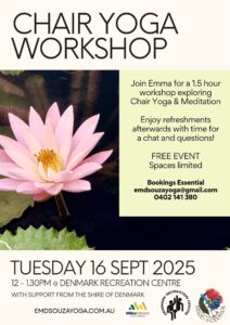 « All Events This event has passed. Chair Yoga Workshop September 16 @ 12:00 pm - 1:30 pm « Death Cafe Life Drawing » Add to calendar Google Calendar iCalendar Outlook 365 Outlook Live Details Date: September 16 Time: 12:00 pm - 1:30 pm Event Categories: Be Connected, Bookings essential, Classes, Community Event, Discover Denmark, Education, Exercise, Free, Health, Men, Mental Health, Networking, Older Australians, Social Event, Wellness, Women, Workshop, Yoga Venue Denmark Recreation Centre Brazier Street Denmark, Western Australia 6330 Australia + Google Map Phone 9848 0344 Related Events Green Skills Denmark Community Garden December 6 @ 3:00 pm - 5:00 pm Christmas Choir Concert December 6 @ 7:00 pm - 8:30 pm Pen & Possibility Creative Writing Workshop December 9 @ 10:00 am - 12:00 pm