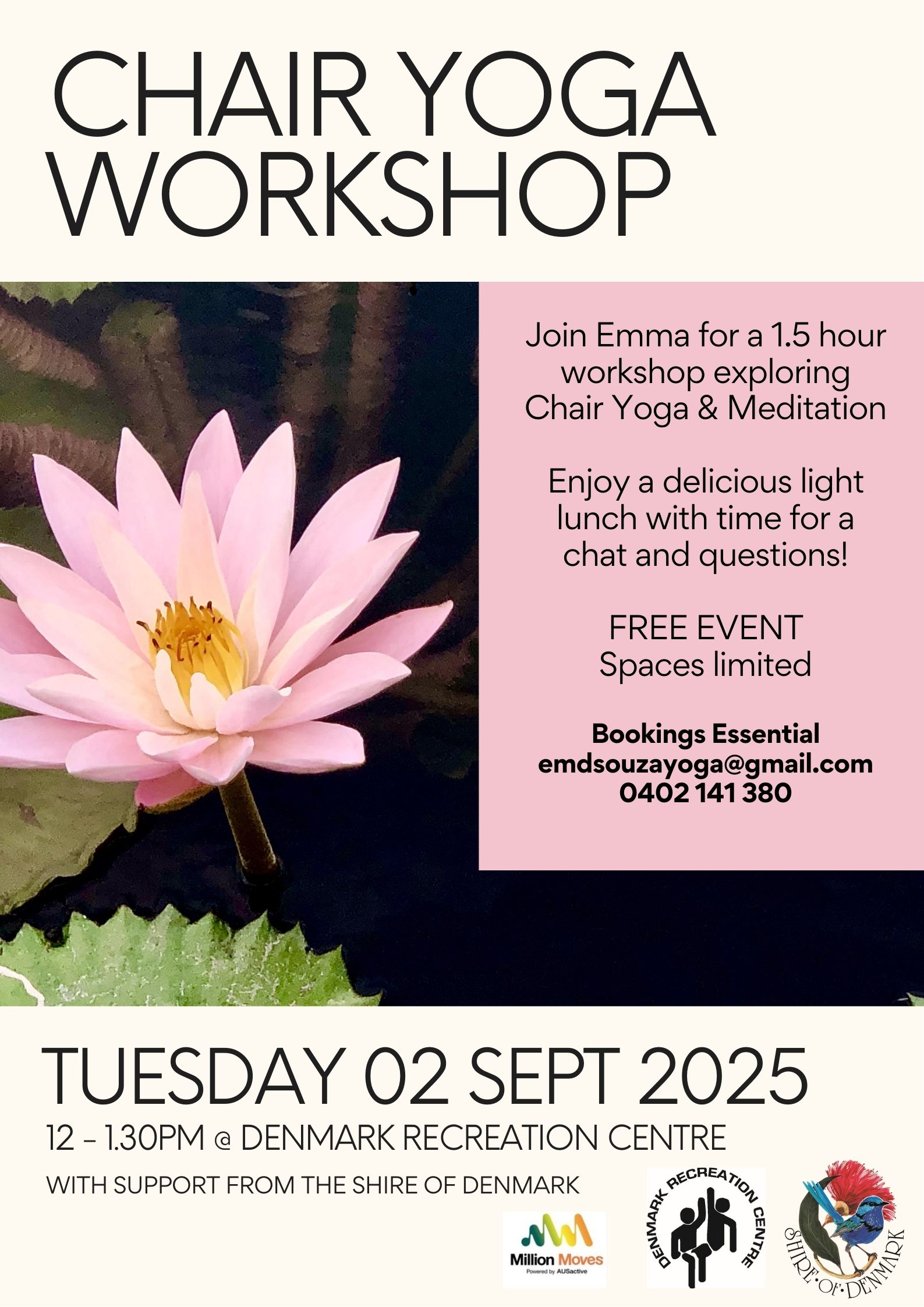 « All Events This event has passed. Chair Yoga Workshop September 2 @ 12:00 pm - 1:30 pm « Embroidery Club Denmark Write People » https://denmarkcrc.com.au/wp-content/uploads/2025/08/Free-Chair-Yoga-Workshop-for-Seniors-2nd-Sept-2025.jpg Add to calendar Google Calendar iCalendar Outlook 365 Outlook Live Details Date: September 2 Time: 12:00 pm - 1:30 pm Event Categories: Be Connected, Bookings essential, Classes, Community Event, Discover Denmark, Education, Exercise, Free, Health, Men, Mental Health, Networking, Older Australians, Social Event, Wellness, Women, Workshop, Yoga Related Events Green Skills Denmark Community Garden December 6 @ 3:00 pm - 5:00 pm Christmas Choir Concert December 6 @ 7:00 pm - 8:30 pm Pen & Possibility Creative Writing Workshop December 9 @ 10:00 am - 12:00 pm