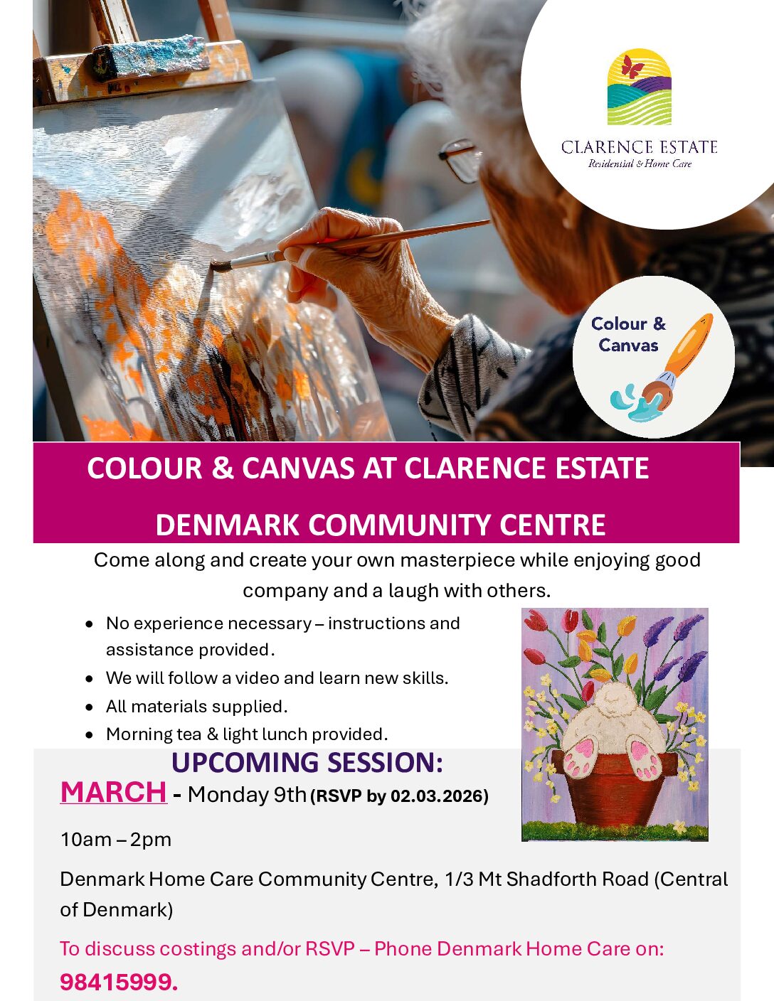 « All Events Colour & Canvas March 9 @ 10:00 am - 2:00 pm « Denmark Women in Business Pen & Possibility Creative Writing Workshop » https://denmarkcrc.com.au/wp-content/uploads/2026/02/COLOUR-AND-CANVAS-MARCHY-26.pdf Add to calendar Google Calendar iCalendar Outlook 365 Outlook Live Details Date: March 9 Time: 10:00 am - 2:00 pm Event Categories: Art, Be Connected, Bookings essential, Classes, Community Event, Education, Entertainment, Older Australians, Workshop Related Events Seniors Activities March 6 @ 10:00 am - 12:00 pm Golden Hill Steiner Markets March 6 @ 2:45 pm - 4:45 pm Golden Hill Steiner Markets March 6 @ 2:45 pm - 4:45 pm