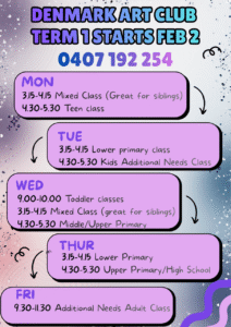 « All Events Denmark Art Club February 2 @ 3:15 pm - April 9 @ 4:15 pm « Colour & Canvas Clarence Estate Denmark Write People » Add to calendar Google Calendar iCalendar Outlook 365 Outlook Live Details Start: February 2 @ 3:15 pm End: April 9 @ 4:15 pm Event Categories: Art, Be Connected, Bookings essential, Child-friendly, Classes, Education, Kids Venue Denmark Art Club corner of Short and Mitchell Street Denmark, WA 6333 Australia + Google Map Phone 0407 192 254 Related Events Pen & Possibility Creative Writing Workshop March 17 @ 10:00 am - 12:00 pm Carers WA Group Catchup March 17 @ 10:00 am - 11:30 am NDIS Session March 17 @ 10:00 am - 11:00 am