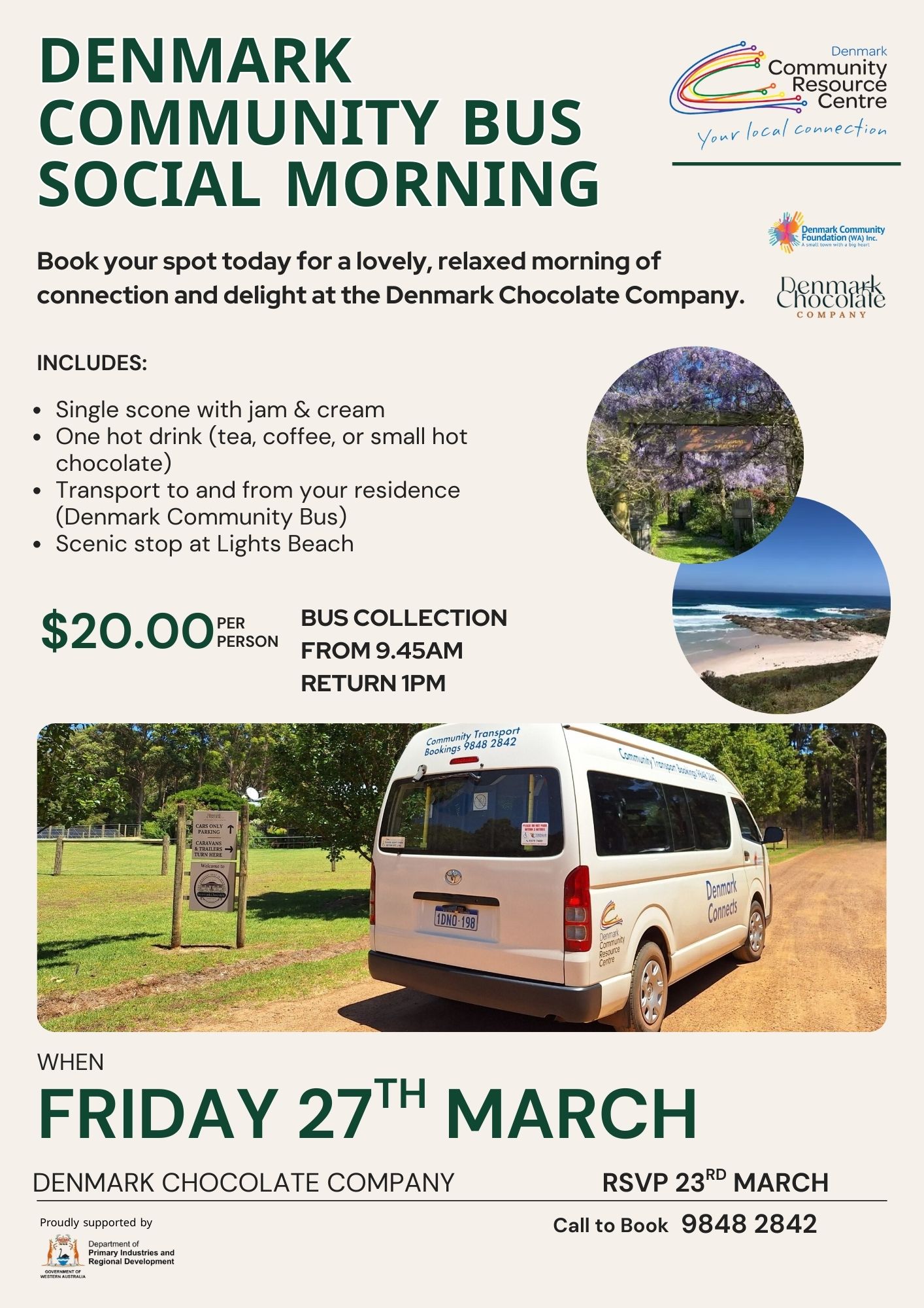 « All Events Denmark Community Bus – Social Morning March 27 @ 9:30 am - 1:00 pm « Chess Book Club – Pen & Possibility » https://denmarkcrc.com.au/wp-content/uploads/2026/03/2026-FEB_23_CommuinityBusOuting_V1_AB.jpg Add to calendar Google Calendar iCalendar Outlook 365 Outlook Live Details Date: March 27 Time: 9:30 am - 1:00 pm Event Categories: Be Connected, Bookings essential, Community Event, Entertainment, Food, Networking Related Events Denmark Women in Business March 16 @ 9:00 am - 4:00 pm Pen & Possibility Creative Writing Workshop March 17 @ 10:00 am - 12:00 pm Carers WA Group Catchup March 17 @ 10:00 am - 11:30 am