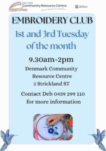 « All Events Event Series: Embroidery Club Embroidery Club 05/01/2027 @ 9:30 am - 2:00 pm « Happy Plate Carers WA Group Catchup » Add to calendar Google Calendar iCalendar Outlook 365 Outlook Live Details Date: 05/01/2027 Time: 9:30 am - 2:00 pm Series: Embroidery Club Event Categories: Art, Be Connected, Child-friendly, Community Event, Entertainment, Free, Mental Health, Older Australians, Social Event, Women Venue Denmark CRC 2 Strickland St Denmark, WA 6333 Australia + Google Map Phone 9848 2842 View Venue Website Related Events Yoga Foundations January 29 @ 4:00 pm - 5:00 pm Golden Hill Steiner Markets January 30 @ 2:45 pm - 4:45 pm Golden Hill Steiner Markets January 30 @ 2:45 pm - 4:45 pm