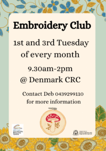 « All Events Event Series: Embroidery Club Embroidery Club 06/01/2026 @ 9:30 am - 2:00 pm « The Mill Art Group Summer 2025 Exhibition Pen & Possibility Creative Writing Workshop » Add to calendar Google Calendar iCalendar Outlook 365 Outlook Live Details Date: 06/01/2026 Time: 9:30 am - 2:00 pm Series: Embroidery Club Event Categories: Art, Be Connected, Community Event, Free, Health, Mental Health, Older Australians, Social Event, Wellness, Women Venue Denmark CRC 2 Strickland St Denmark, WA 6333 Australia + Google Map Phone 9848 2842 View Venue Website Related Events Denmark Arthouse Blues & Roots December 5 @ 6:00 pm - 9:00 pm Green Skills Denmark Community Garden December 6 @ 3:00 pm - 5:00 pm Christmas Choir Concert December 6 @ 7:00 pm - 8:30 pm