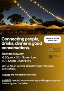 « All Events This event has passed. Mingle with Singles November 15 @ 6:30 pm - 9:00 pm « Golden Hill Steiner Markets Karri Kids Potions in the Park » Add to calendar Google Calendar iCalendar Outlook 365 Outlook Live Details Date: November 15 Time: 6:30 pm - 9:00 pm Event Categories: Be Connected, Community Event, Dance, Entertainment, Free, Men, Mental Health, Music, Networking, Social Event, Women Venue Boston Brewing Co 678 South Coast Hwy, Denmark, WA 6333 Australia + Google Map Phone 9848 1555 View Venue Website Related Events Green Skills Denmark Community Garden December 6 @ 3:00 pm - 5:00 pm Christmas Choir Concert December 6 @ 7:00 pm - 8:30 pm Pen & Possibility Creative Writing Workshop December 9 @ 10:00 am - 12:00 pm