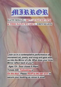 « All Events This event has passed. Mirror August 30 @ 6:50 pm - 9:30 pm « Denmark Community Garden Workshop Colour & Canvas at Clarence Estate » Add to calendar Google Calendar iCalendar Outlook 365 Outlook Live Details Date: August 30 Time: 6:50 pm - 9:30 pm Event Categories: Art, Awareness, Bookings essential, Community Event, Dance, Music, Networking, Social Event Venue The Sanctuary Denmark, WA 6333 Australia + Google Map Related Events Green Skills Denmark Community Garden December 6 @ 3:00 pm - 5:00 pm Christmas Choir Concert December 6 @ 7:00 pm - 8:30 pm Pen & Possibility Creative Writing Workshop December 9 @ 10:00 am - 12:00 pm